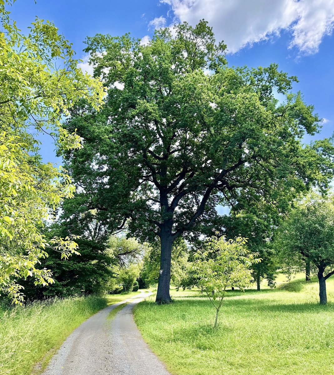 Auch die zweite Stieleiche liegt unterhalb des Hohenaspergs. Auf der Straße Richtung Tamm nimmt man rechts den ersten Feldweg und schon kann man sie sehen, die über 100 Jahre alte Stieleiche.