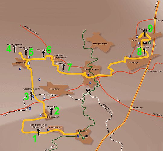 Stationen und Distanzen (von Asperg ausgehend):